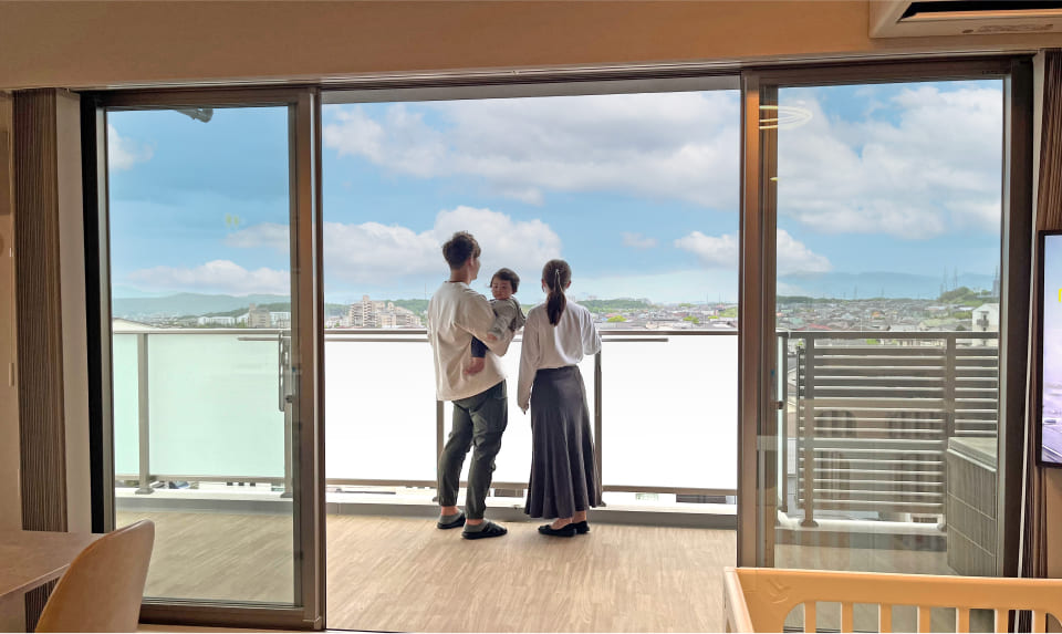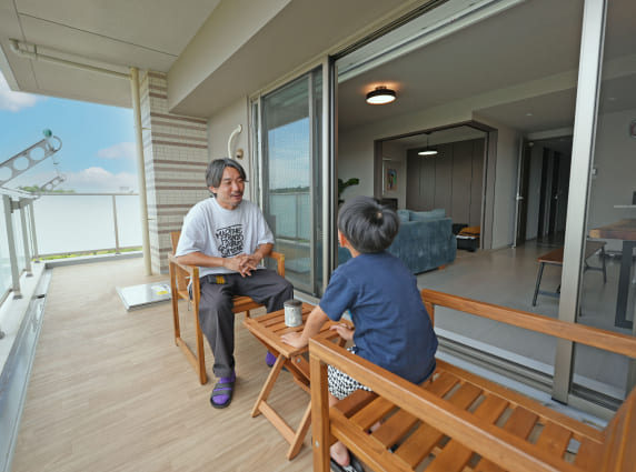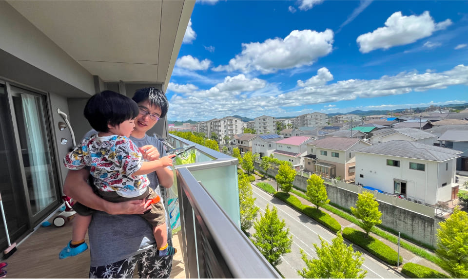 生活環境は、駅前にイオンやロピアなど買物施設がまとまっているのでとても暮らしやすいです。あと、なんと言ってもこの眺望ですね。実際の建物で広いバルコニーからこの眺めをみて、「めっちゃいいやん!」と。住む前に想像していた暮らしとのギャップもなく、マンションの快適さを満喫しています。