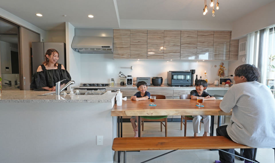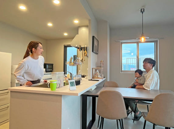 南向きで開けた眺望は夕日が綺麗に見えるんですよ。バルコニーも広いので、主人と子ども達はバルコニーでゆったりと朝食を楽しんだりしていますね。キッチンはこだわりの詰まったスペースで、毎日が楽しくなりますし、収納が多いのも良いですね。あと、子どもがまだ小さいので防犯面がしっかりしている点も住んでみて、良かったなと思った点です。