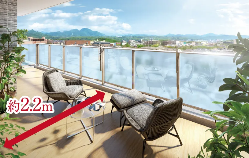 最大出幅2.2mのバルコニーを全邸に採用しています。