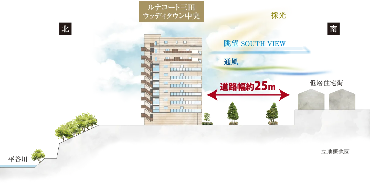 南側は戸建て住宅が広がっているためここにしかない開放感を享受することができます。心を穏やかにする潤いも、どこまでも続く爽やかな空も、日常の風景としてお楽しみいただけます。